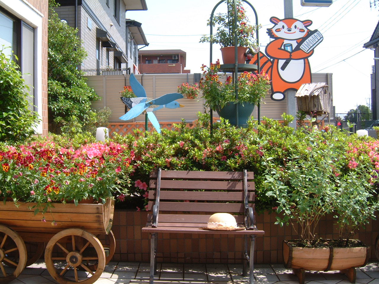 茶色のレンガタイル作りの建屋です。季節によって、屋外デコレーションしています。